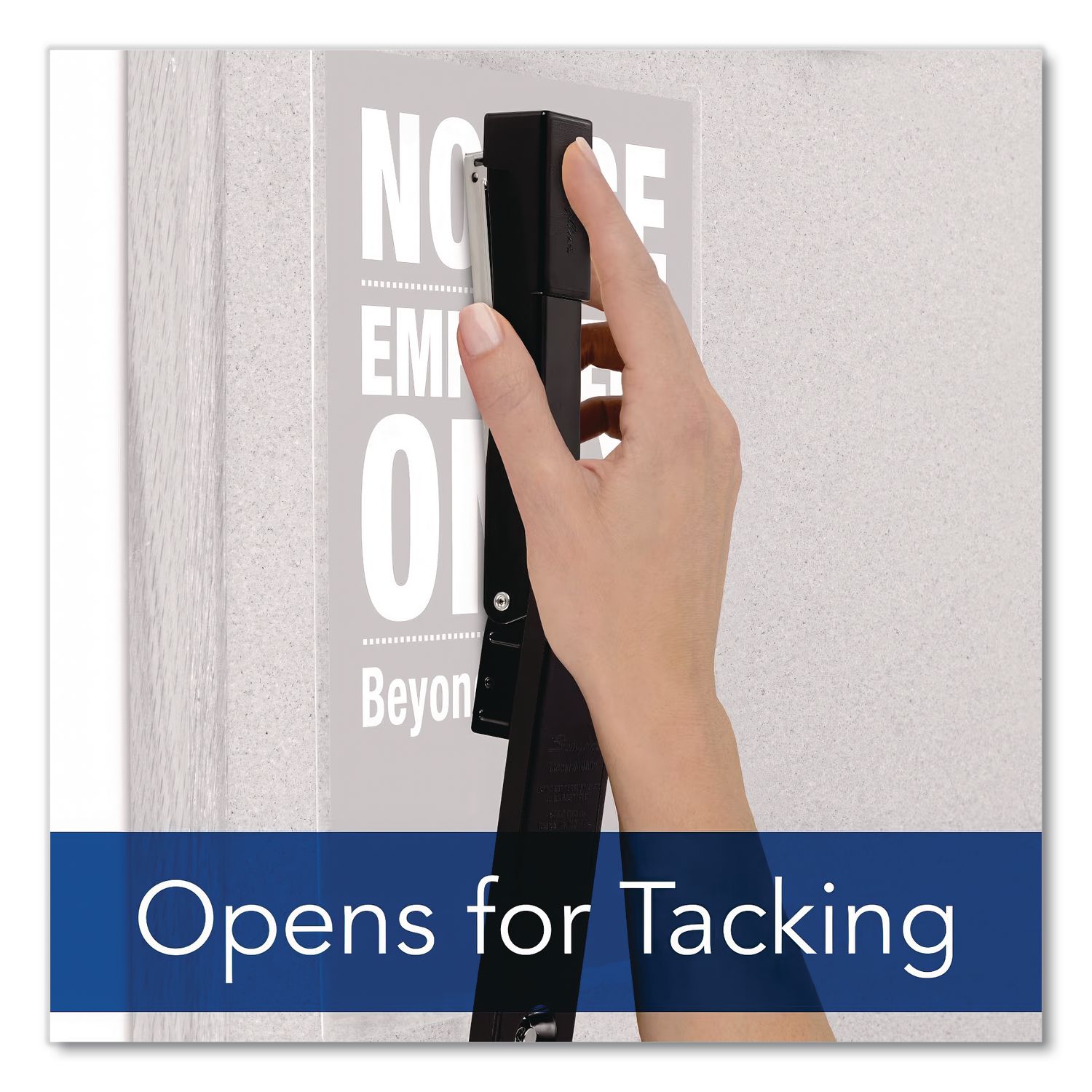 - Stapler opens for tacking ability to post papers to bulletin boards and other vertical surfaces.