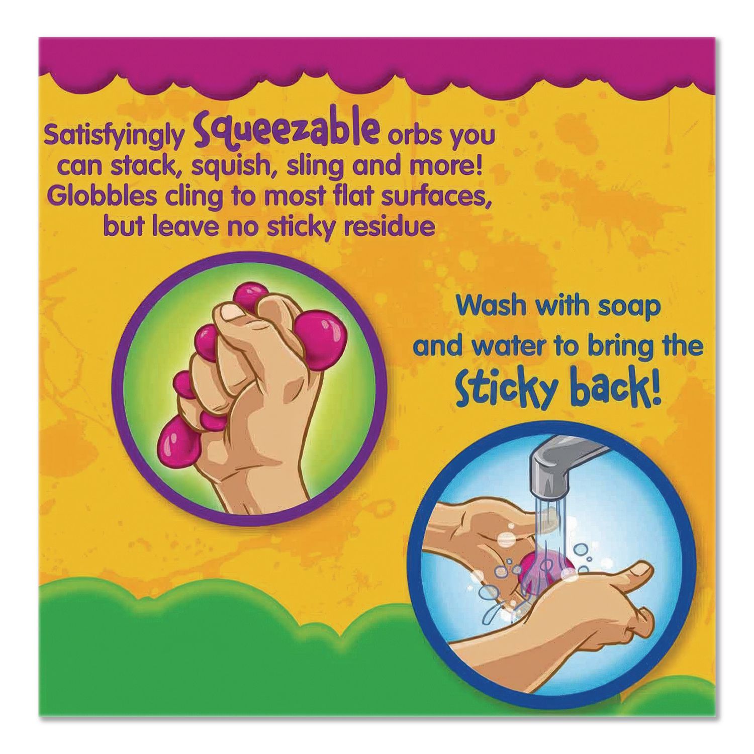 - These super sticky squeeze toys never leave a sticky residue behind and remain sticky even after being washed.